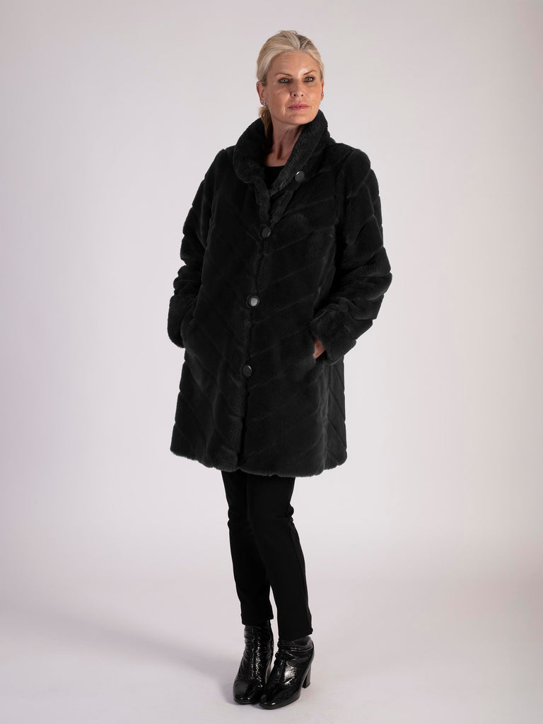 Wrap yourself in timeless elegance with our Black Faux Fur Reversible Coat — a versatile piece designed for both warmth and style. Crafted in a beautifully soft faux fur, this coat can be worn two ways: with the plush faux fur side on show for a glamorous finish, or reversed for a sleeker, more understated look. Its neutral ecru tone makes it easy to pair with any outfit, while the relaxed cut ensures a flattering fit and all-day comfort. Perfect for special occasions or elevating your everyday wardrobe, this coat is a must-have winter layer that combines luxury with practicality. Length: 89cm.