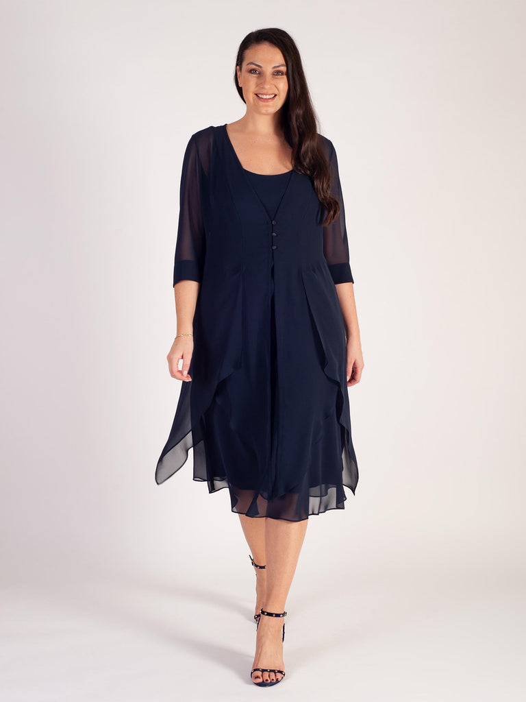 Elegant calf length, fully lined sleeveless chiffon dress bias cut to fit and flatter. Team with lovely Blush Sequin and Embroidered Scallop Mesh Jacket, or our navy cornelli lace jacket add heels and a hatinator for that special occasion. Dress length 119cm from shoulder neck point to hem.
