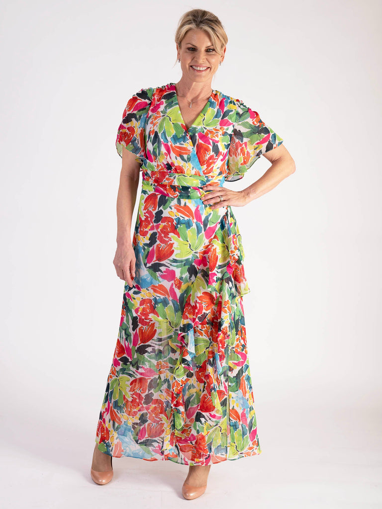 Crafted from a light and airy chiffon fabric with delicate metallic stripes, this vibrant dress exudes elegance. Adorned with an enchanting tropical print throughout, it offers a burst of colour perfect for parties and special occasions. The faux wrap V-neckline adds a touch of allure, while the empire line feature accentuates the silhouette. Feminine angel sleeves and a floor-length skirt with cascading frills complete the enchanting look. Ideal for a summer wedding invite, this dress measures 150cm from shoulder neck point to hem, ensuring a graceful presence.