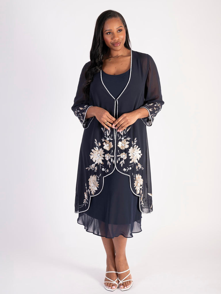 Navy Chiffon Coat with White/Gold Bead & Sequin Detailing