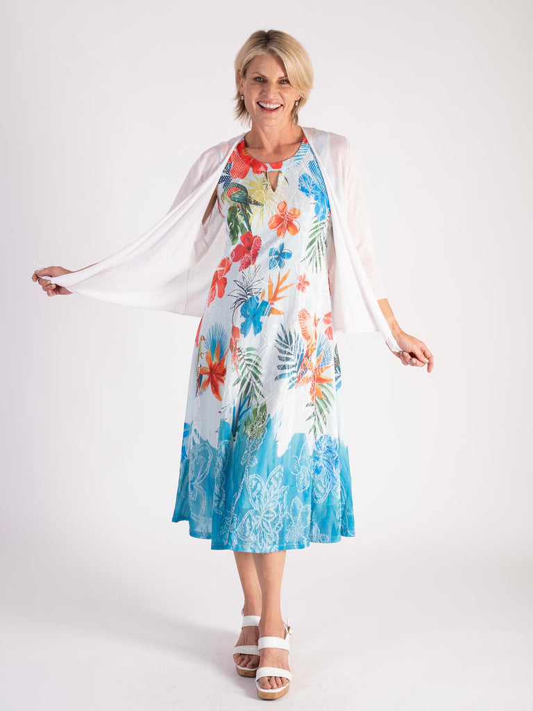 Enhance your spring/summer wardrobe with our White/Multi Hibiscus Border Mesh Dress. Featuring an A-line silhouette and adorned with an hibiscus print this midi dress radiates charm and sophistication. The stylish cut-out neckline and sleeveless design make it a versatile choice for any summer social event. Pair effortlessly with a shawl or bolero for a chic look. Dress length: 130cm from shoulder neck point to hem. Bring the allure of summer to your style with this captivating dress. Pair with one of our silk mix cardigans - White 4004CS23